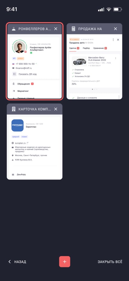 Поддерживается единая логика взаимодействия с интерфейсом — employee journey начинается с карточки клиента/обращения, а затем предлагаются уникальная для модуля операция и последующий набор шагов для неё.